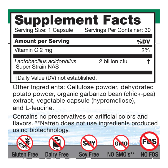 5 billion cfu: Lactobacillus acidophilus, NAS super strain